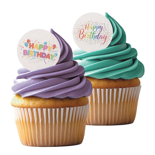 24 x Happy Birthday Edible Wafer Cupcake Toppers – Pre-Cut 3.8cm Birthday Cake Decorations – Thick Wafer Paper – Colourful Cupcake Toppers for Kids & Adults