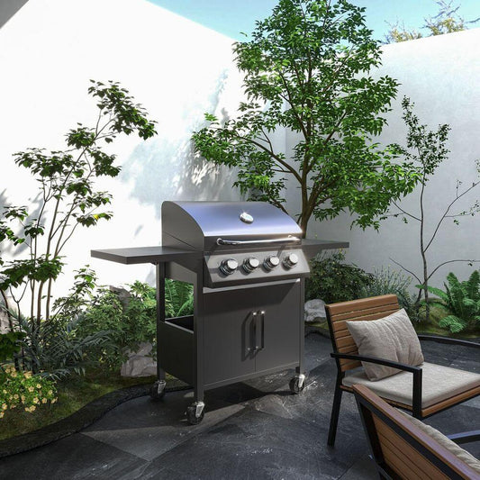 Outsunny 4 Burner Gas Grill Portable BBQ Trolley w/ 4 Wheels and Side Shelves