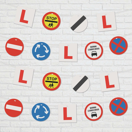 Learner Driver Party Bunting - 18pc / 4m Ribbon - 17th Birthday, New Driver Party Decorations, L Plates & Traffic Signs