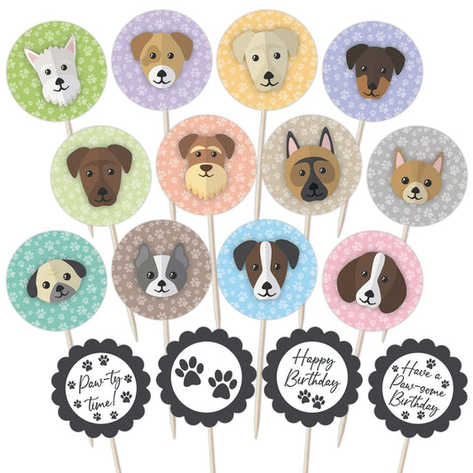 Cute Dogs Birthday Cupcake Toppers Set - 24pc - Cute Dog Faces & Paw-some Birthday Signs | Cupcake & Cake Decorations