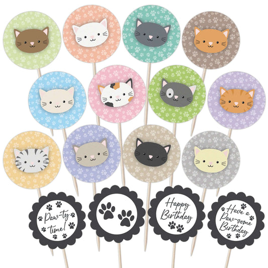 Cute Cats Birthday Cupcake Toppers Set - 24pc - Cute Cat Faces & Paw-some Birthday Signs | Cupcake & Cake Decorations