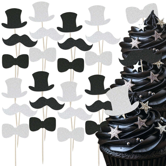 Gentleman Themed Glitter Cupcake Toppers Set - 24pc - Top Hat, Moustache & Bow Ties | Perfect Stag Do's, Birthdays, Weddings & Roaring Twenties Parties | Cupcake & Cake Decorations
