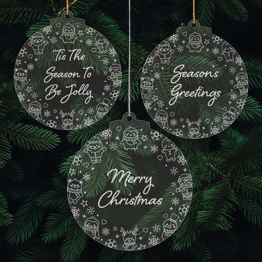 Let It Snow Christmas Cuties Tree Baubles - Set of 3 Engraved Clear Acrylic Festive Decorations - 8.8 cm