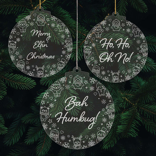 Bah Humbug Christmas Cuties Tree Baubles - Set of 3 Engraved Clear Acrylic Festive Decorations - 8.8 cm