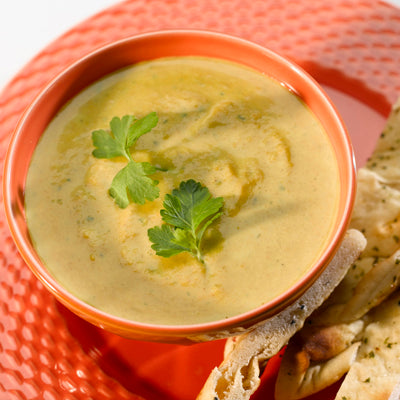 - Whizz in batches in a food processor with the single cream and coriander until smooth. Top with the coriander leaf and serve with fingers of warm nan bread.