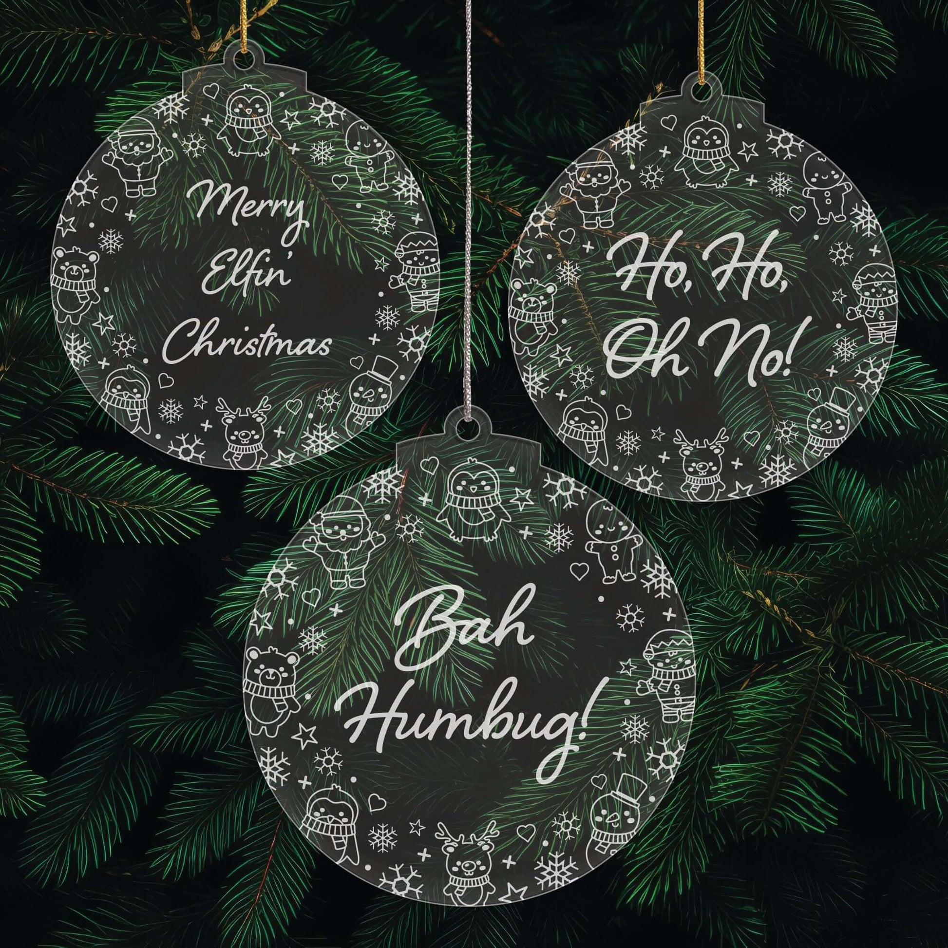 Add a touch of festive sparkle to your Christmas tree with this set of three beautifully engraved acrylic baubles. Each decoration is crafted from 3 mm thick clear acrylic and precision laser-engraved with a cute Christmas character border and fun seasonal sayings.