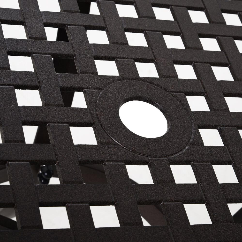 - The table features a central hole for a parasol to enable you to sit in the shade.