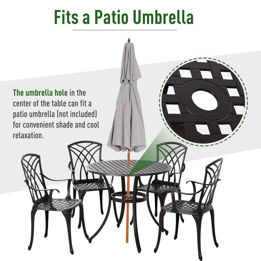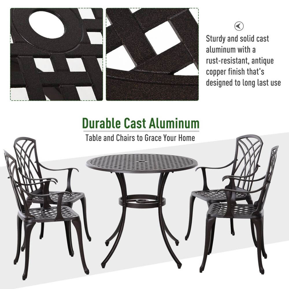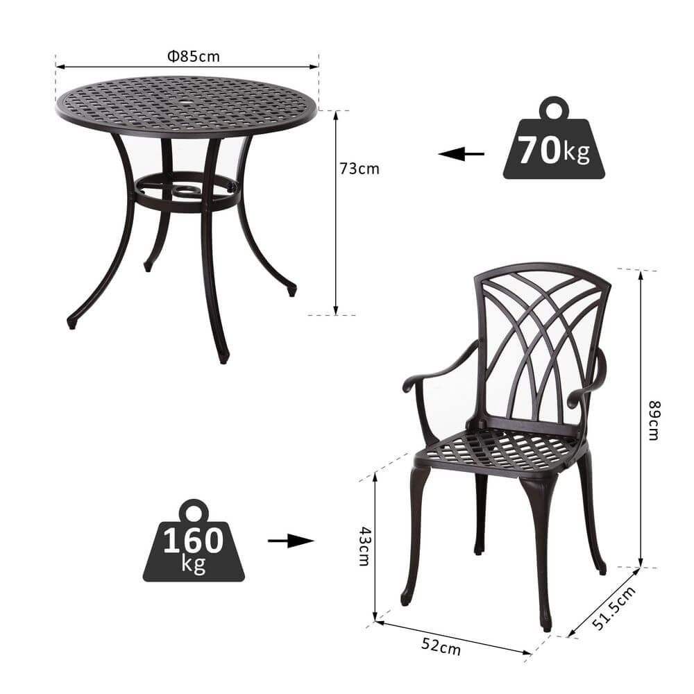 A beautiful-looking garden bistro table and chair set. No matter how short you are on space in your home and outdoors, this five-piece Stamford set from Outsunny will give you the perfect spot to dine and relax. It consists of four bistro chairs and a matching table, with cast aluminium forming the frames to ensure they are sturdy and tough, as well as resistant to rusting and mild everyday wear and tear. Round in shape, the table features a middle hole to keep a sun parasol securely in place, with the back of the chairs showcasing a cut-out design for an attractive finish whether seated or not. Ideal for flats and apartments with balconies.