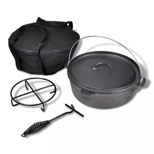 - This Dutch oven is delivered with a black carrying bag, a cover with a raised edge, a lid lifter and a stand.