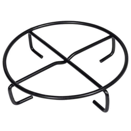 - A small Dutch oven complete with a black carry case, a cover with a raised edge, a lid lifter and a stand.