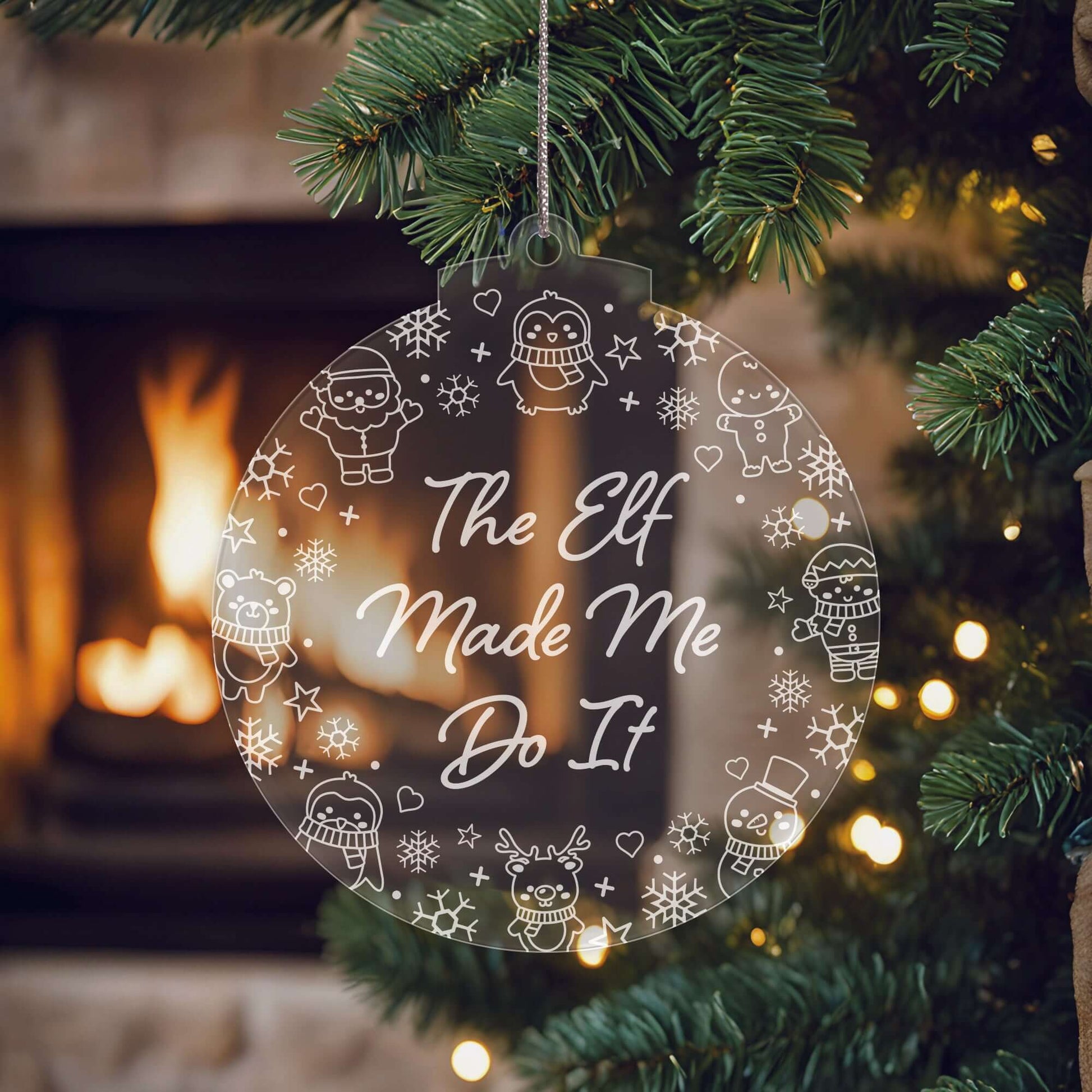 🎄 Set of 3 Ornaments – Features three uniquely engraved baubles with festive sayings: Chillin’ With My Elves, The Elf Made Me Do It, Elfin’ Around.