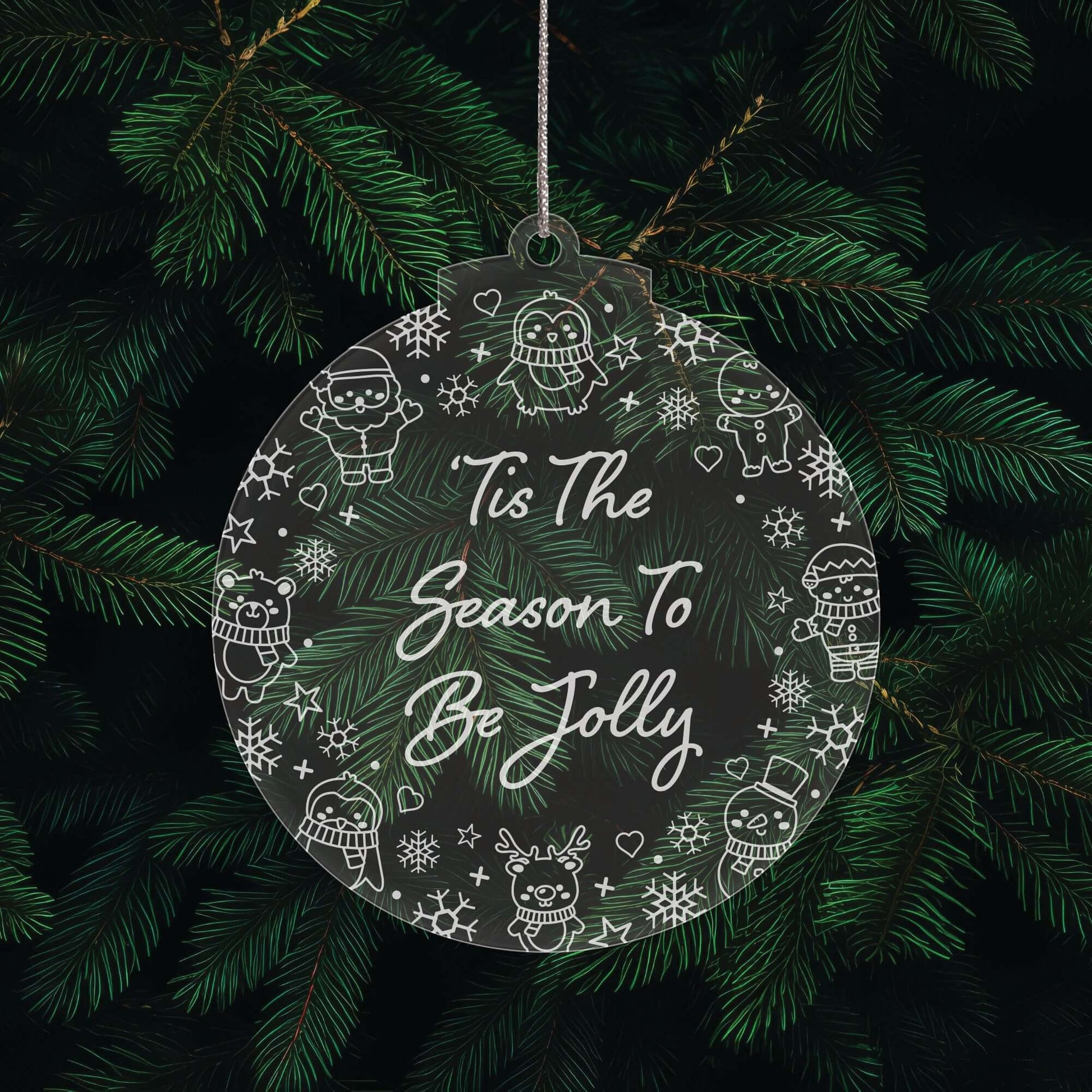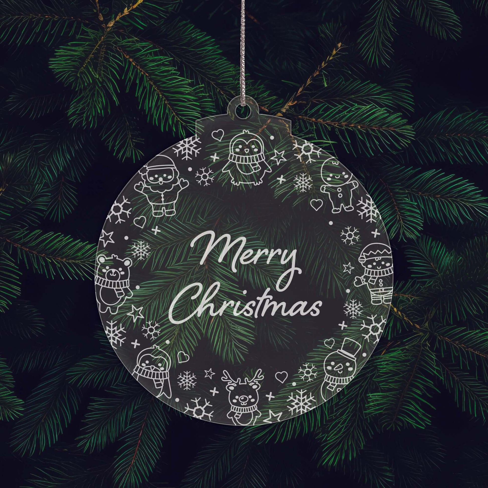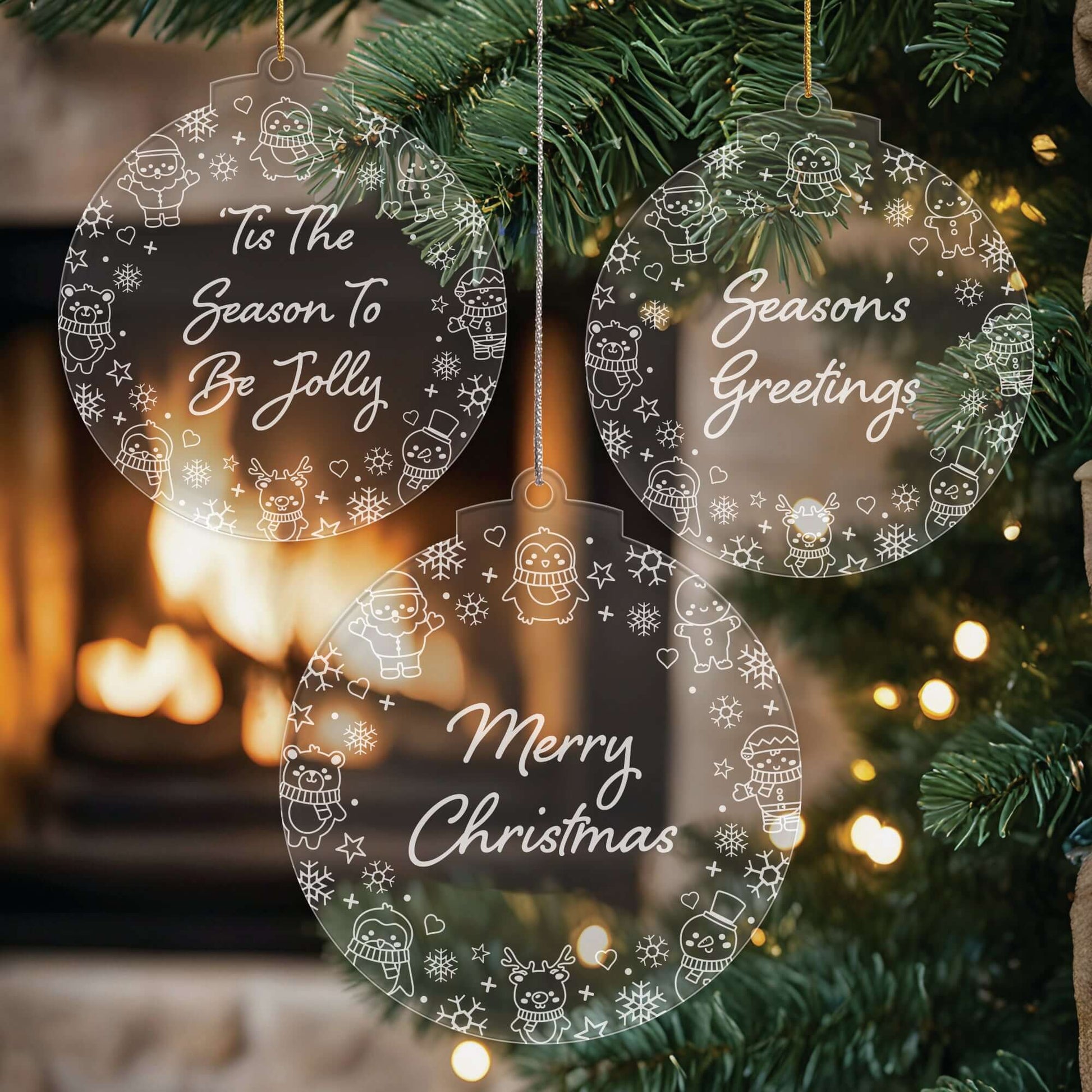 Add a touch of festive sparkle to your Christmas tree with this set of three beautifully engraved acrylic baubles. Each decoration is crafted from 3 mm thick clear acrylic and precision laser-engraved with a cute Christmas character border and fun seasonal sayings.