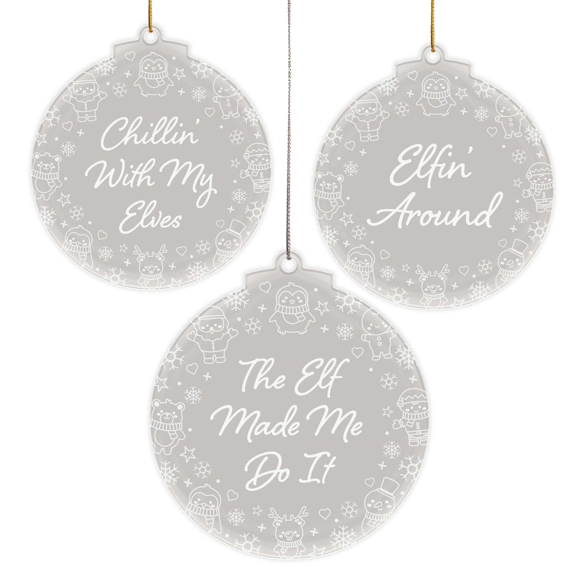 Add a touch of festive sparkle to your Christmas tree with this set of three beautifully engraved acrylic baubles. Each decoration is crafted from 3 mm thick clear acrylic and precision laser-engraved with a cute Christmas character border and fun seasonal sayings.