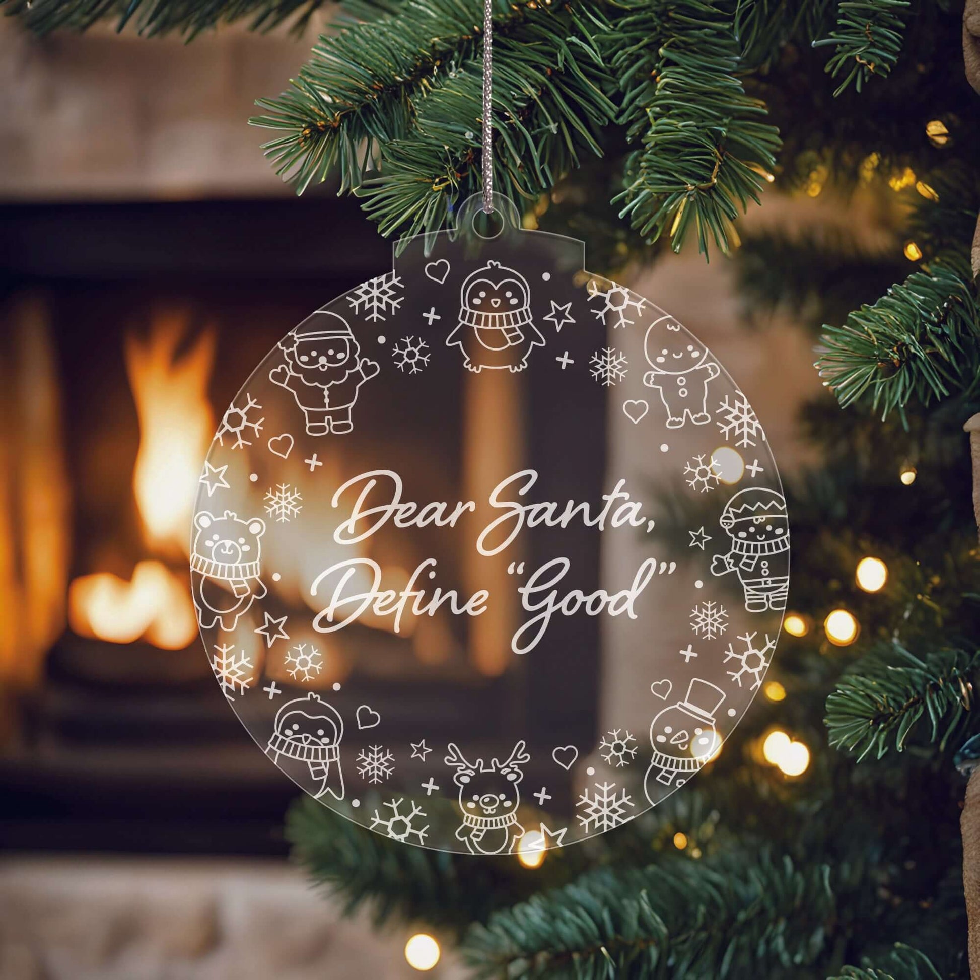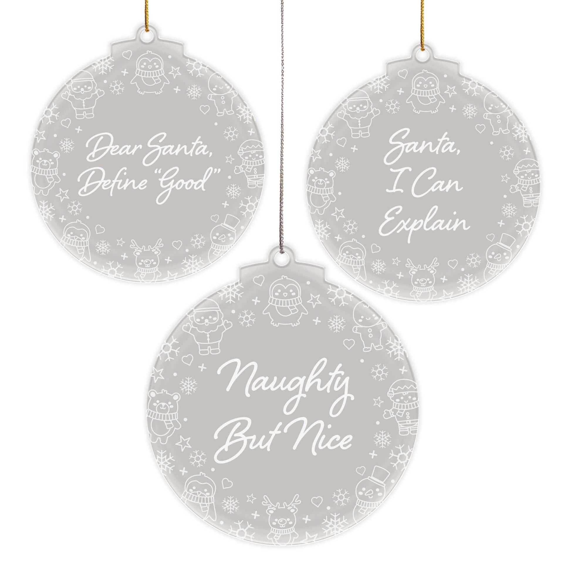 🎄 Set of 3 Ornaments – Features three uniquely engraved baubles with festive sayings: Dear Santa, Define “Good”, Naughty But Nice & Santa, I Can Explain.