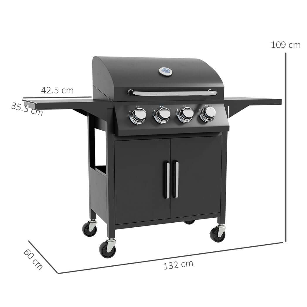 Outsunny 4 Burner Gas Grill Portable BBQ Trolley w/ 4 Wheels and Side Shelves
