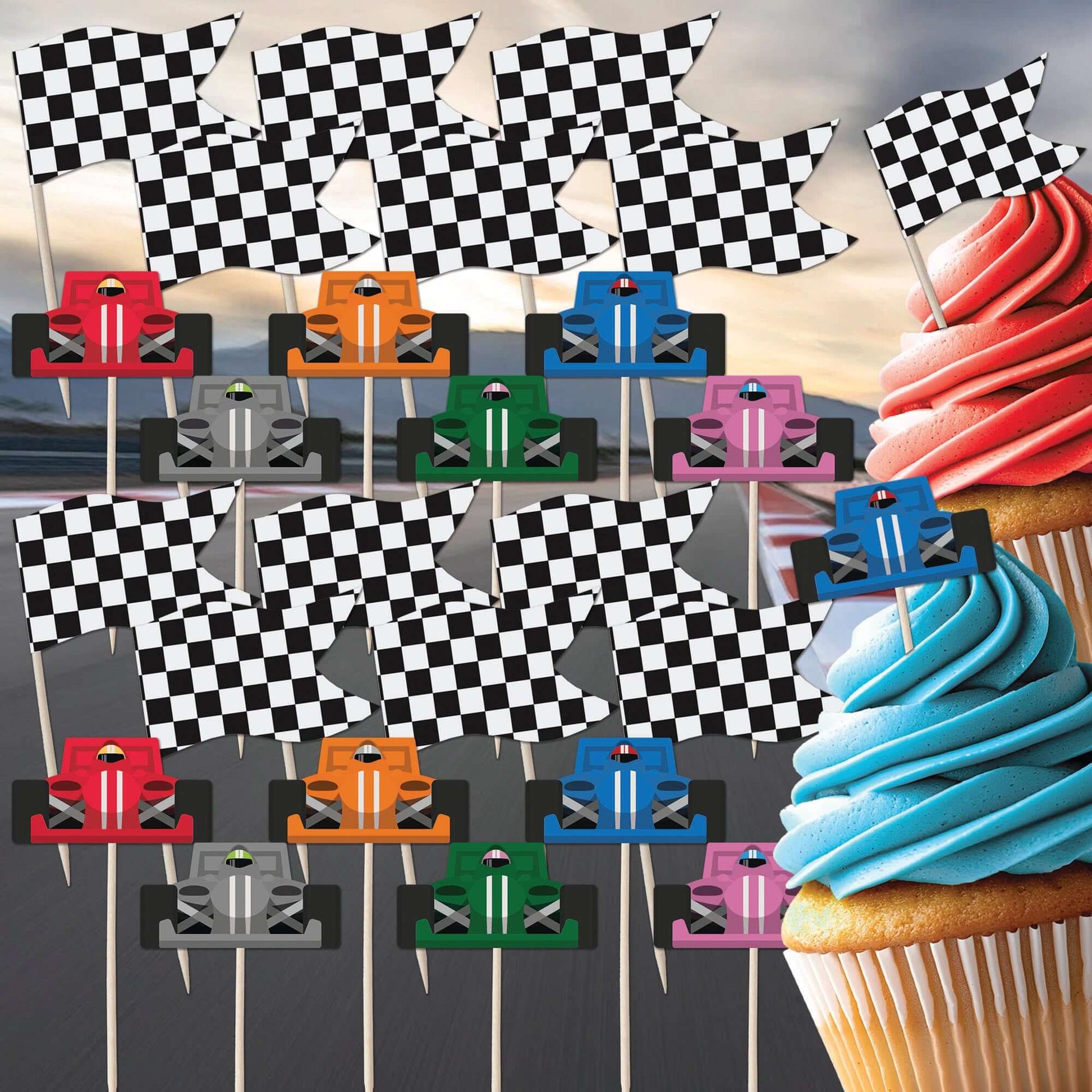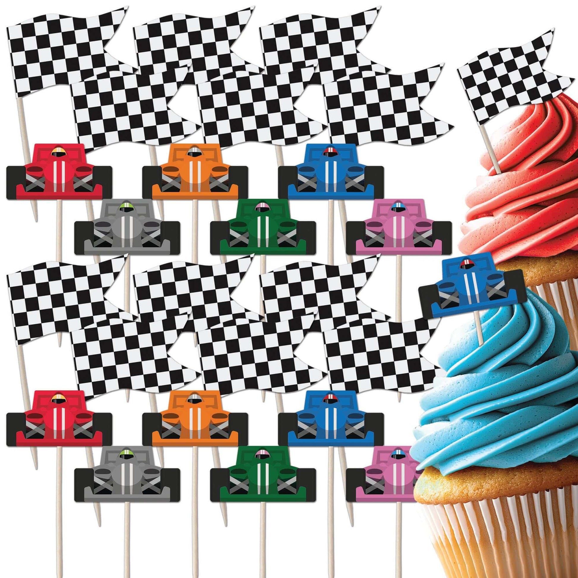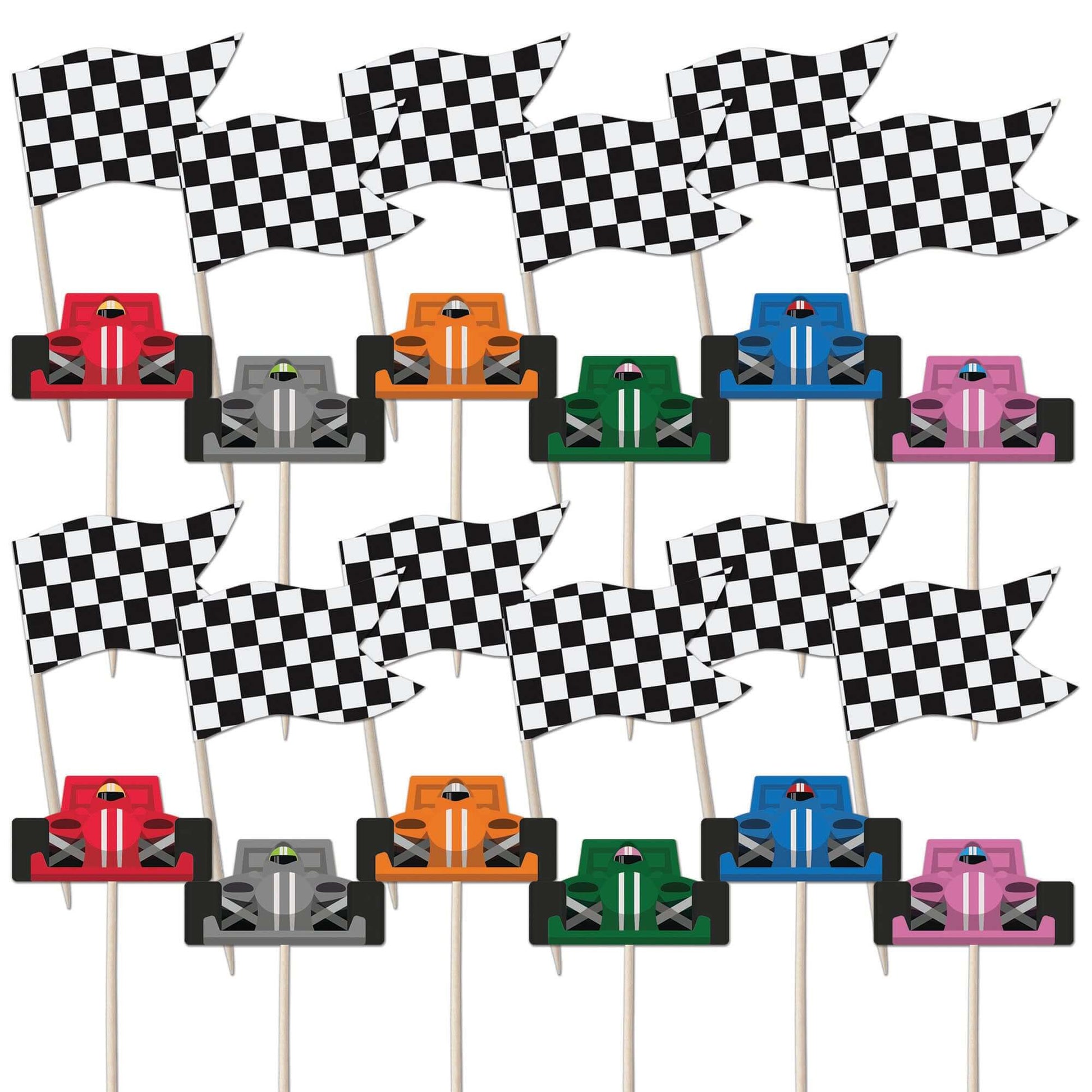 Racing Car & Chequered Flag Cupcake Toppers Set - 24pc - Birthday Celebration Cupcake & Cake Decorations