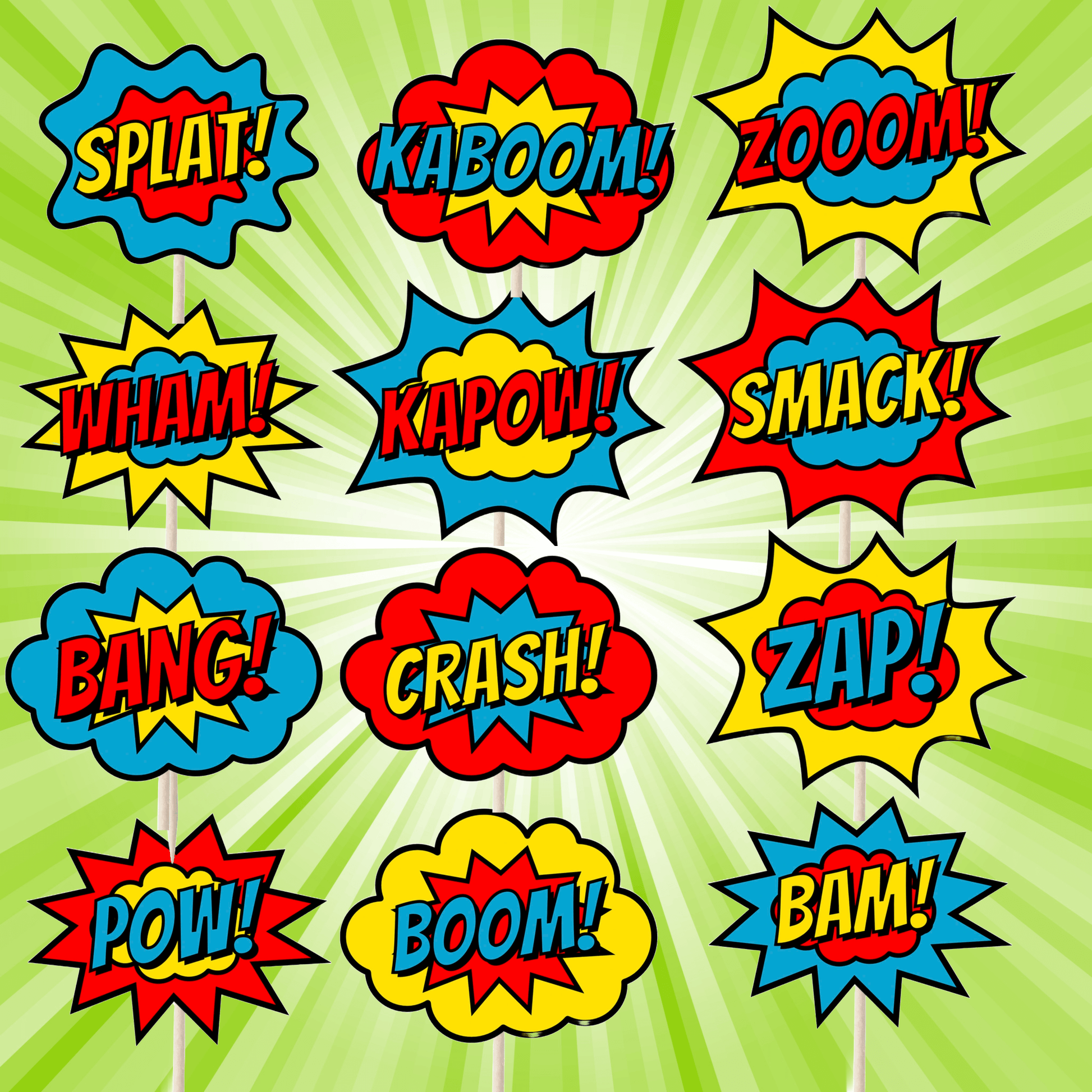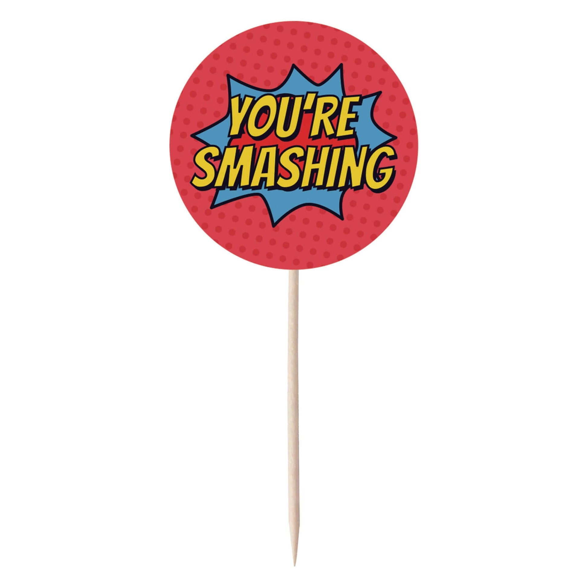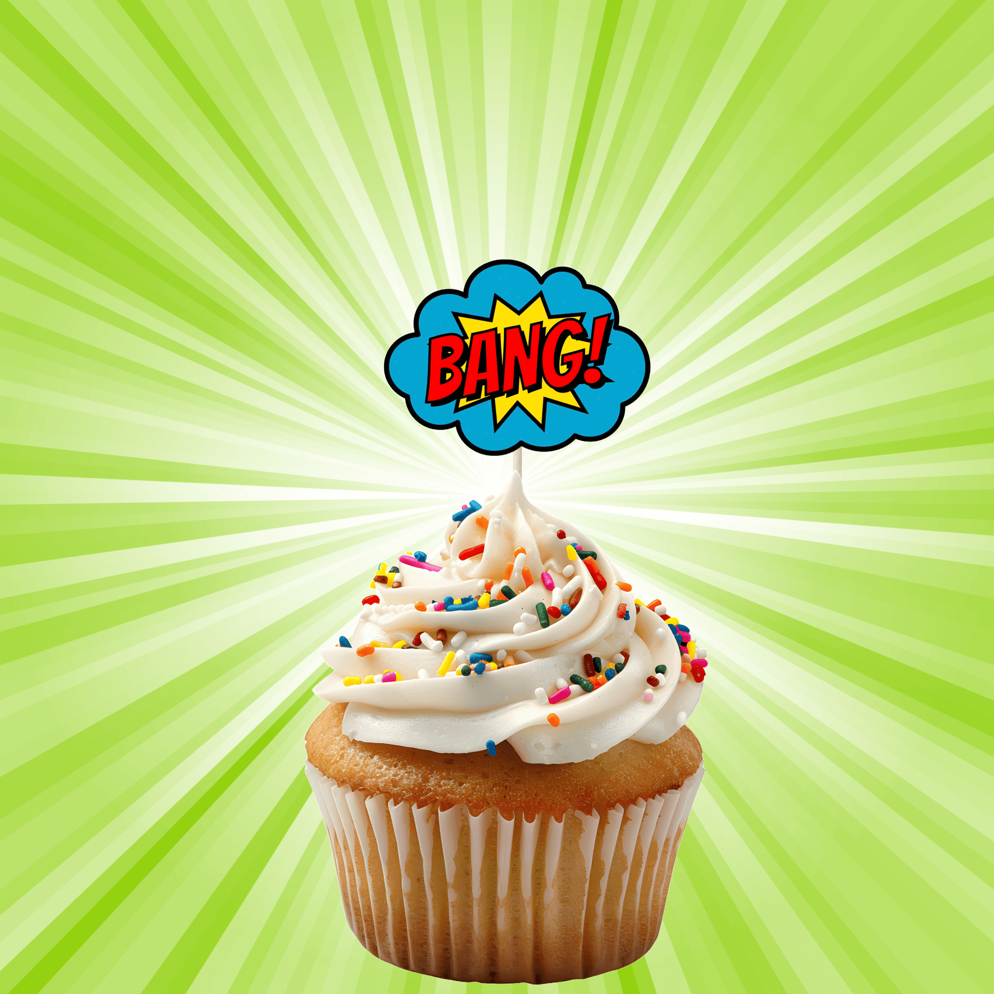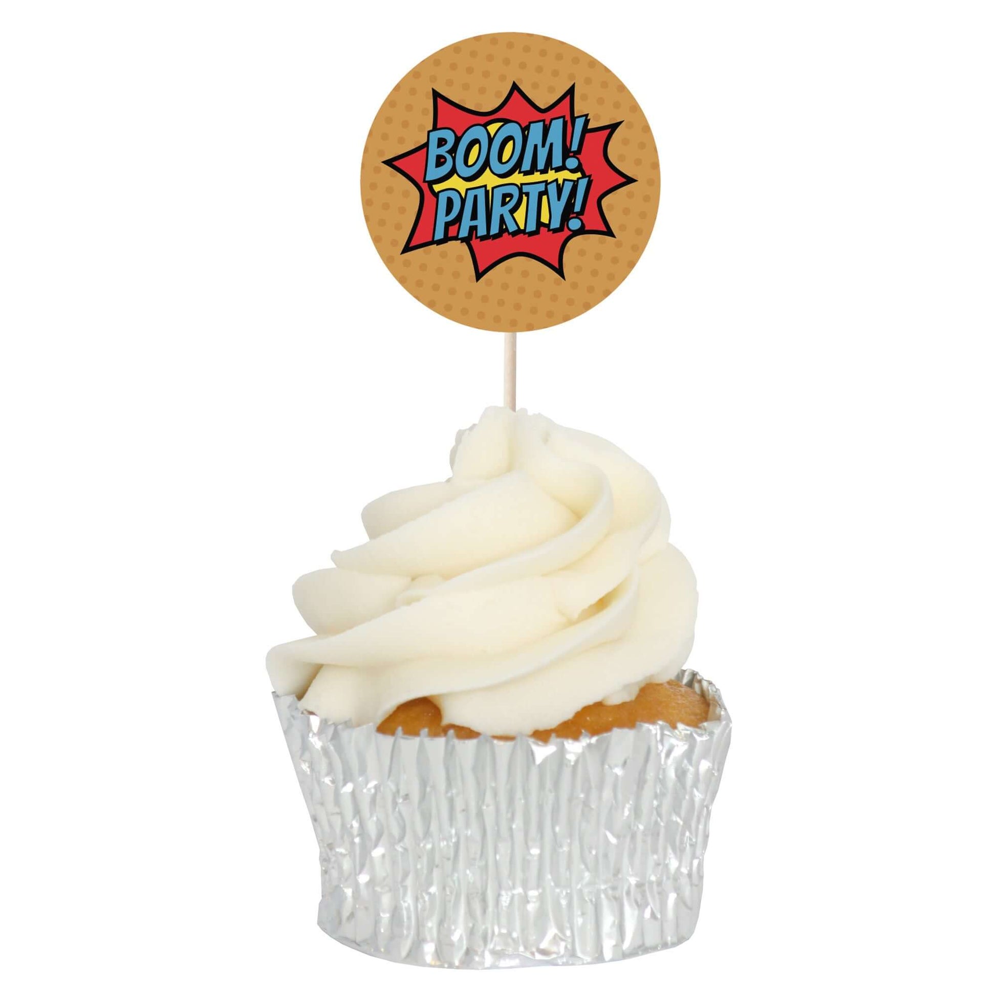 Bring some action to your party with this bold and colourful set of comic book and hero-themed cupcake toppers! Featuring classic comic-style bursts and fun hero-inspired phrases, they’re perfect for adding a playful punch to your celebration.