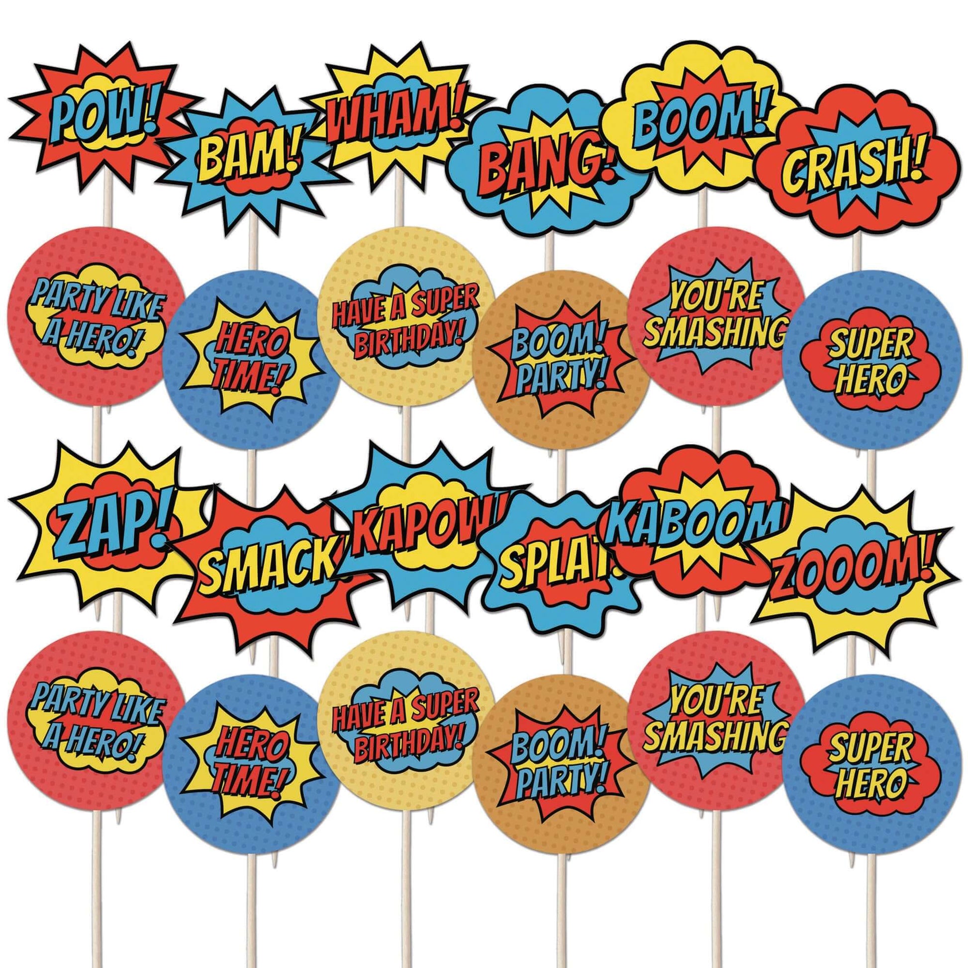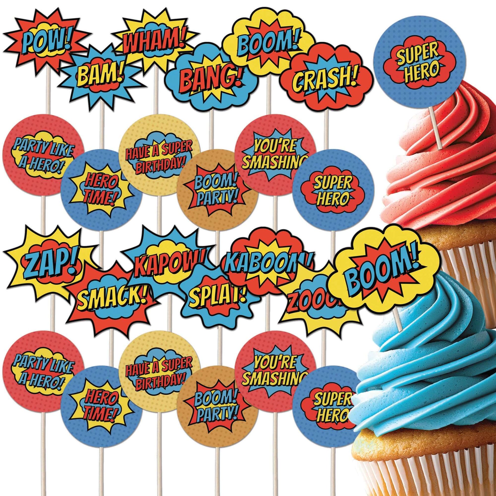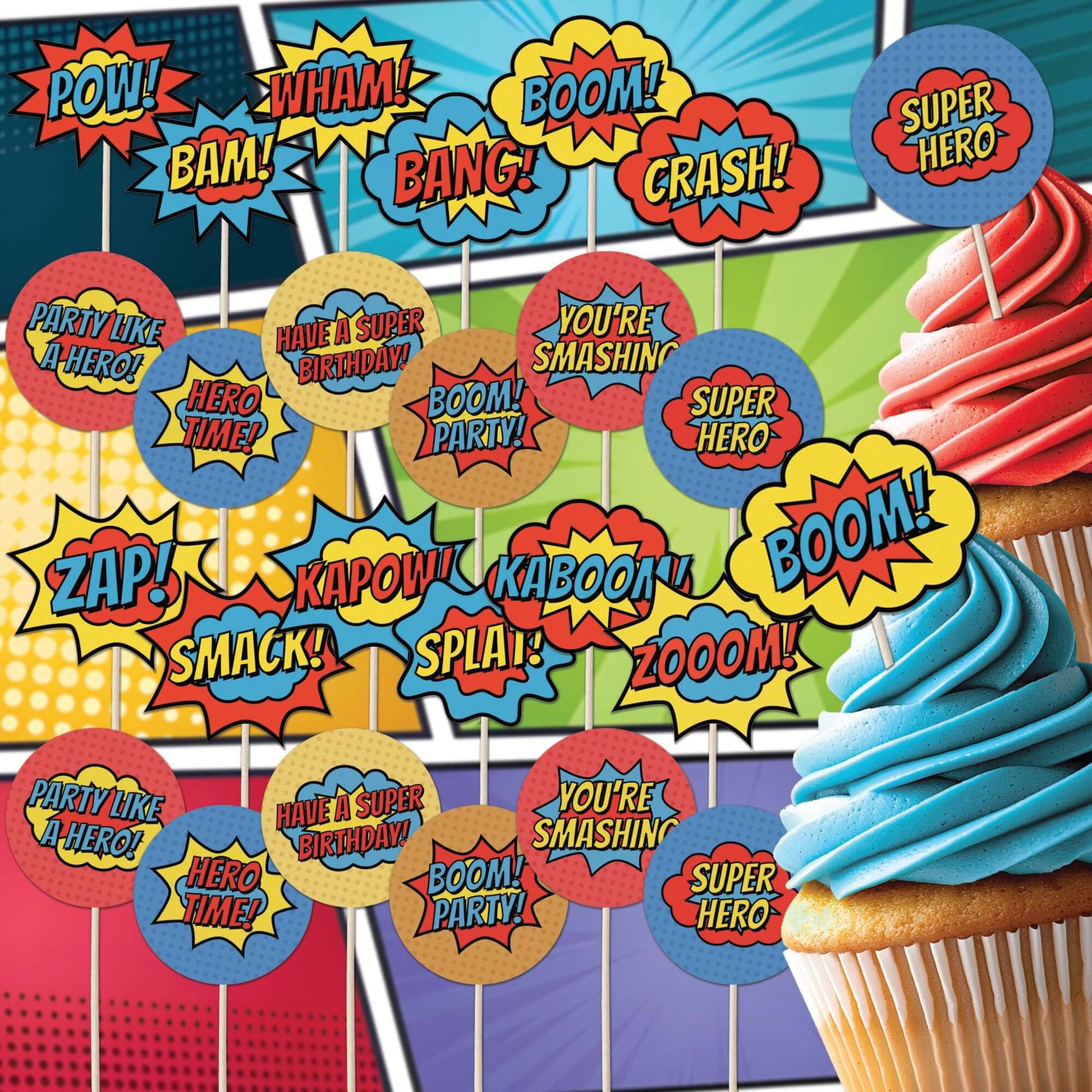 Superhero Comic Book Cupcake Toppers Set - 24pc - Birthday Celebration Cupcake & Cake Decorations