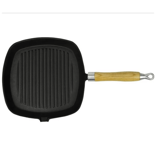 - This grill pan features a heavy-duty cast iron skillet and 100% natural wood handle (with threaded steel rods inside). It has an internal ribbed base, thereby requiring no oil or fat while cooking.